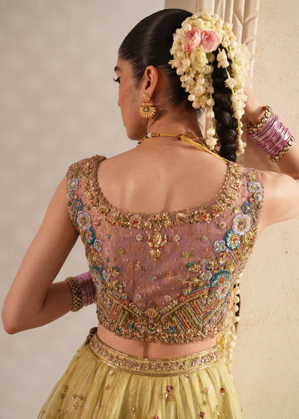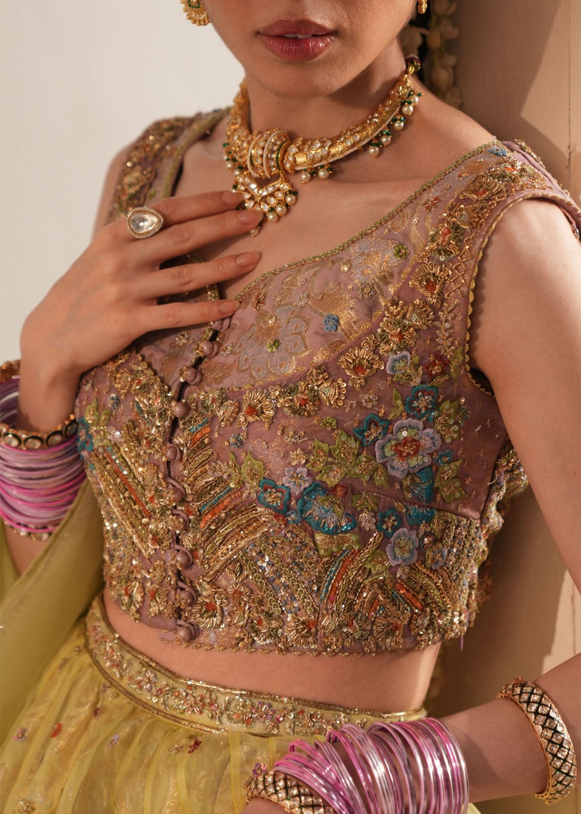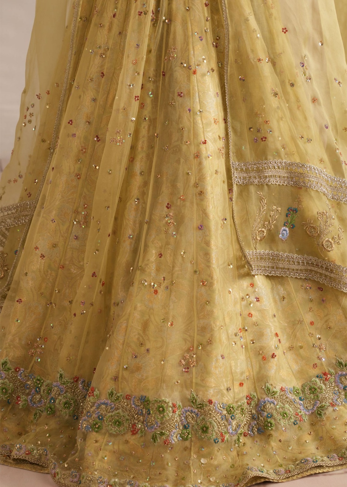 ​The Choli (Blouse) is the masterpiece of the set, densely packed with “Adda” work—a traditional hand-embroidery technique using silk threads (Resham), sequins, and tilla. The floral motifs are rendered in soft pastels (pinks, blues, and ochre), creating a beautiful garden-like effect against the green base.