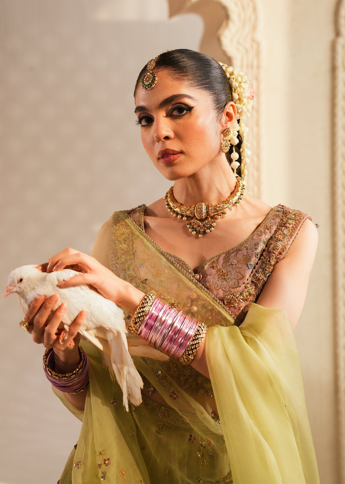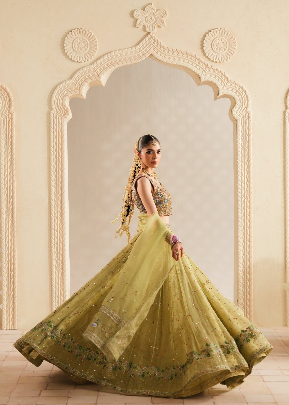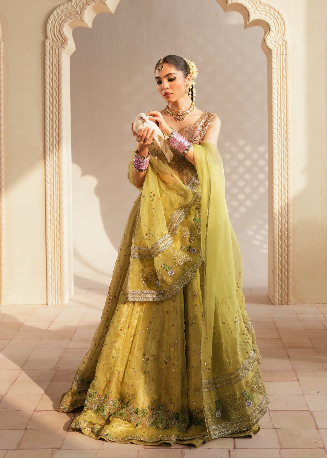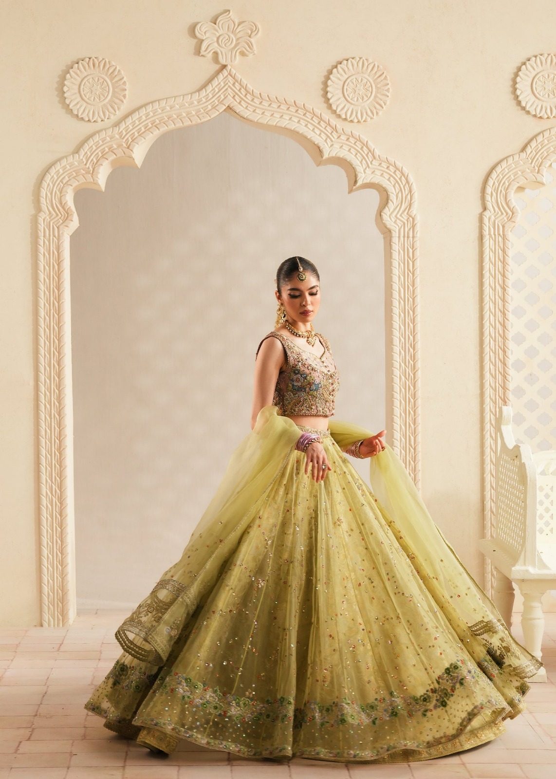 ​Embrace timeless elegance with this exquisite three-piece ensemble. The outfit centers around a luminous lime-green palette, crafted on premium sheer organza to provide a regal yet lightweight silhouette.