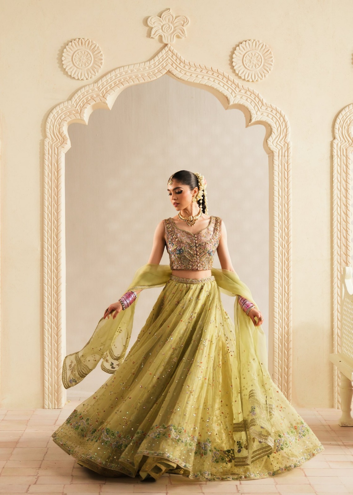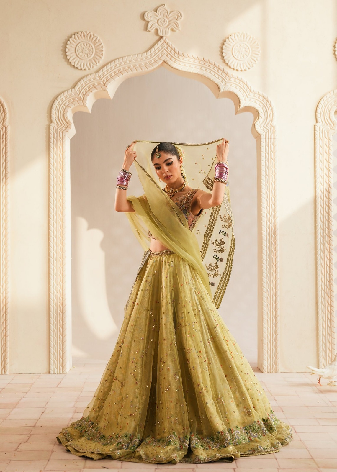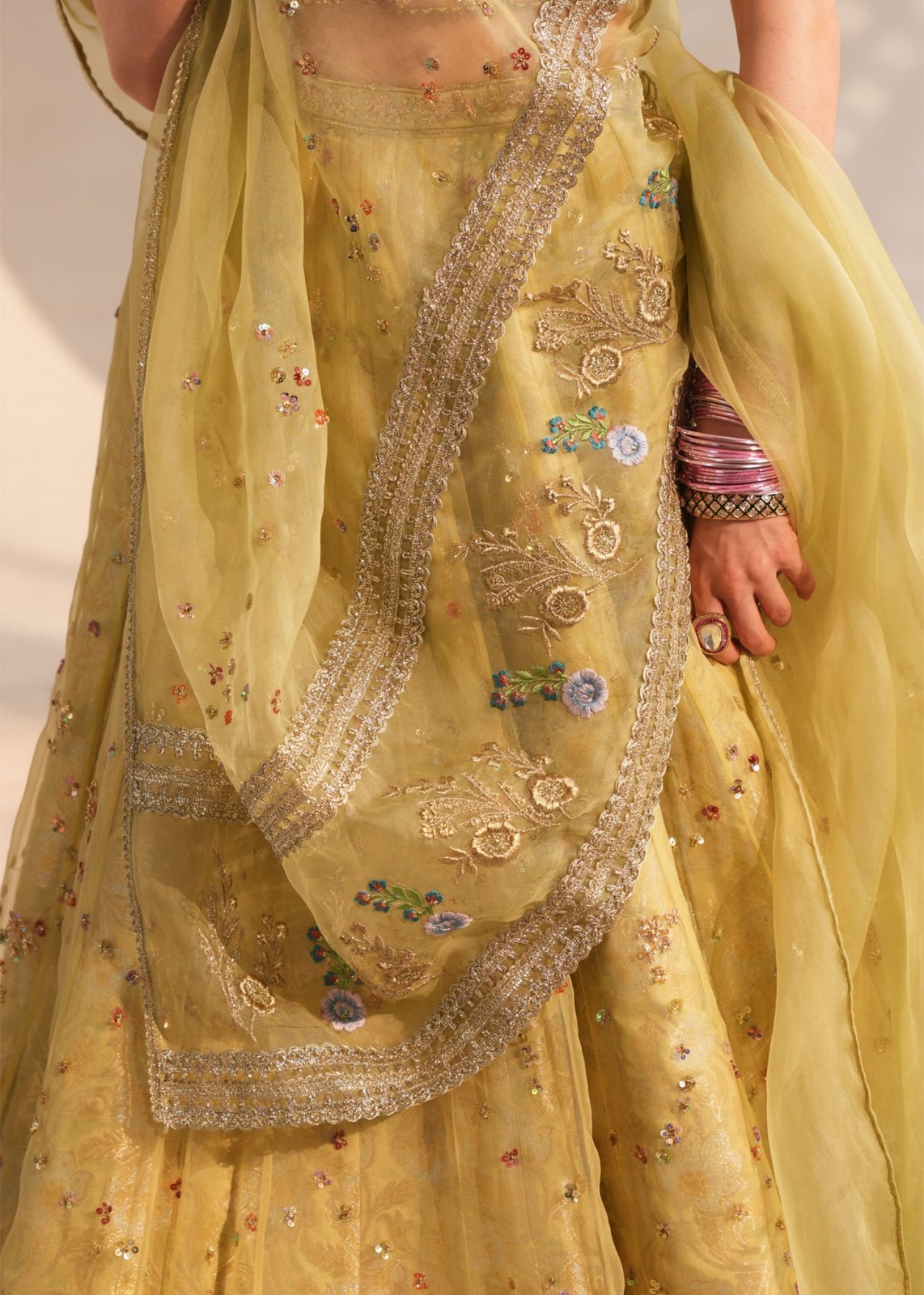 ​The look is completed with a diaphanous organza dupatta, finished with delicate lace borders and light embroidery, perfect for a graceful drape over the shoulder or head.