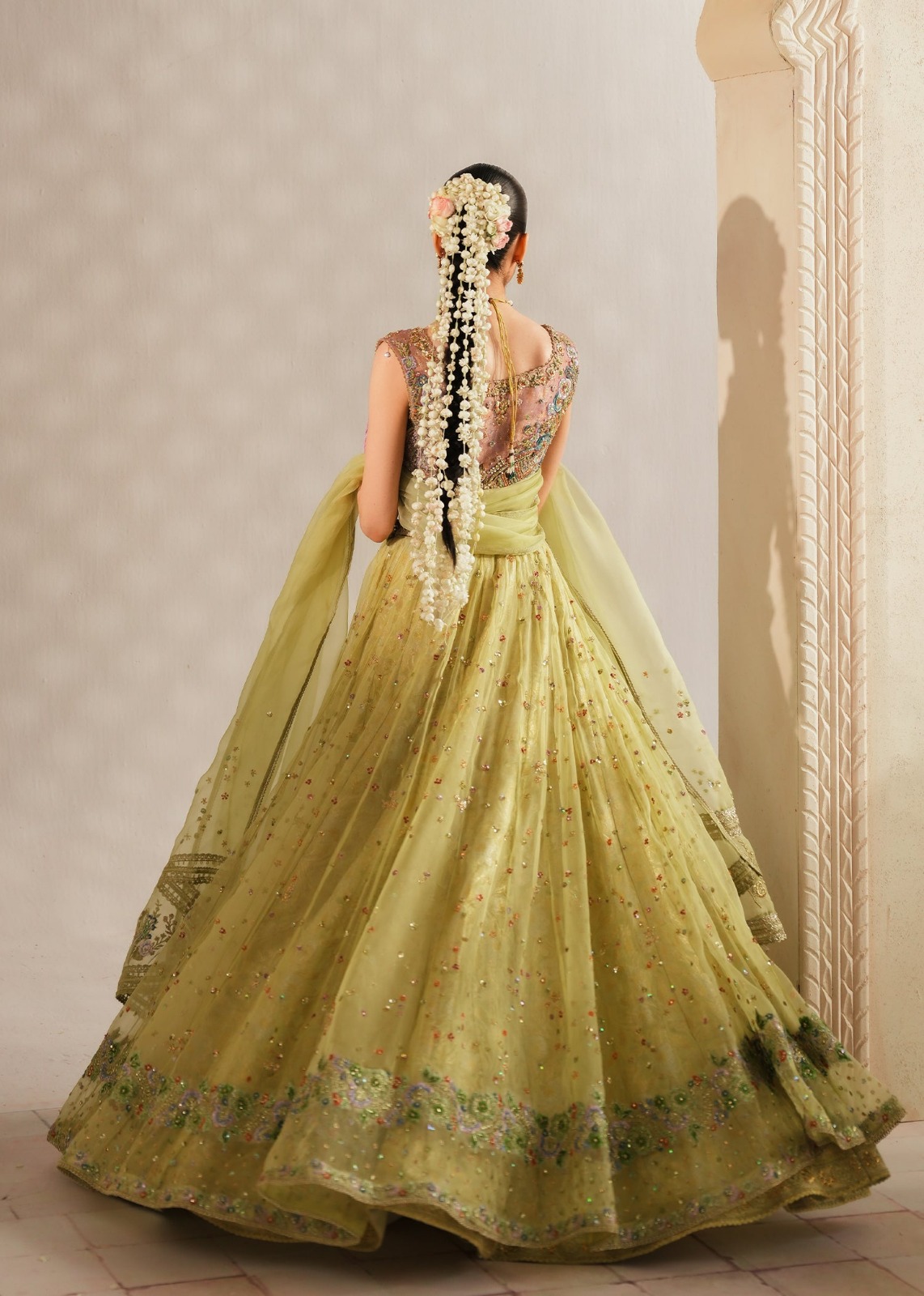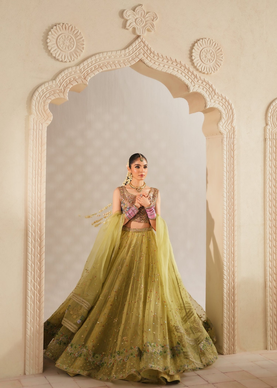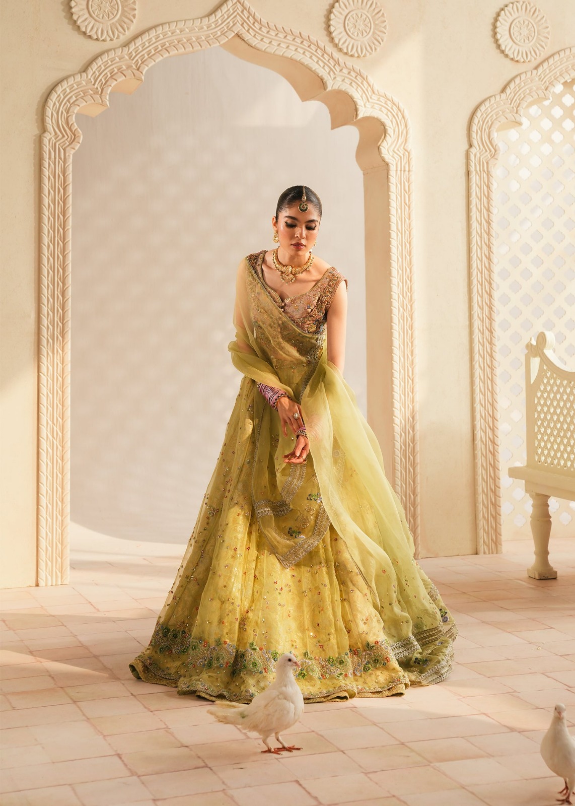 ​The look is completed with a diaphanous organza dupatta, finished with delicate lace borders and light embroidery, perfect for a graceful drape over the shoulder or head.